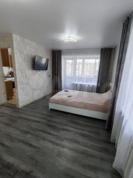 В квартире выполнен косметический ремонт. Просторная лоджия с видом на город. В комнате установлены шкафы и телевизор. Кухня оборудована необходимой техникой, включая холодильник. Санузел совмещённый, оснащён современной сантехникой.