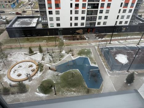 Высотный дом с огороженной территорией и детской площадкой.