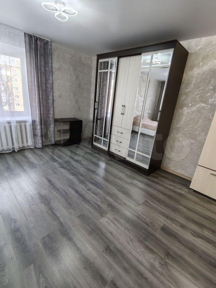 В квартире выполнен косметический ремонт. Просторная лоджия с видом на город. В комнате установлены шкафы и телевизор. Кухня оборудована необходимой техникой, включая холодильник. Санузел совмещённый, оснащён современной сантехникой.