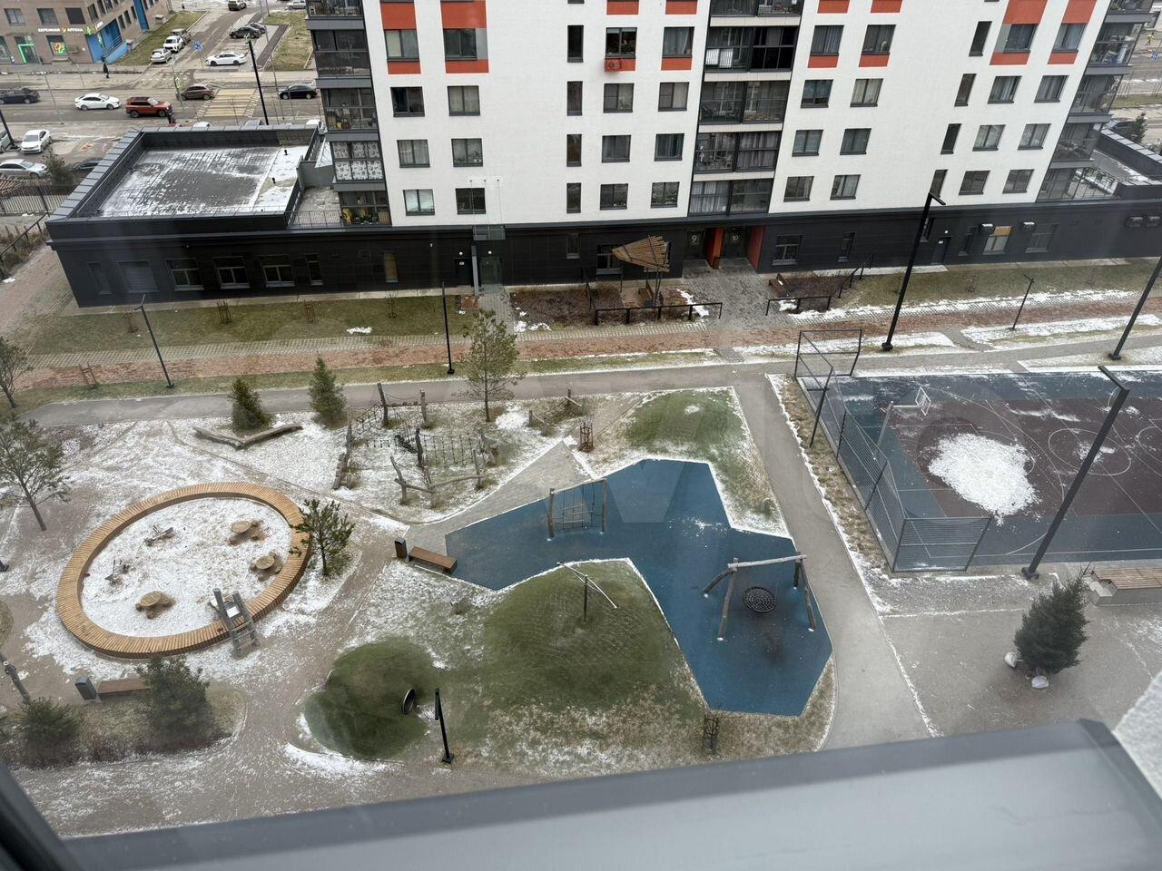 Высотный дом с огороженной территорией и детской площадкой.