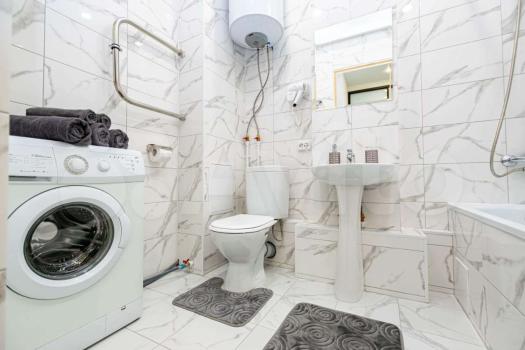 В ванной комнате совмещеный санузел со стиральной машиной и водонагревателем, инсталляция.