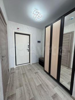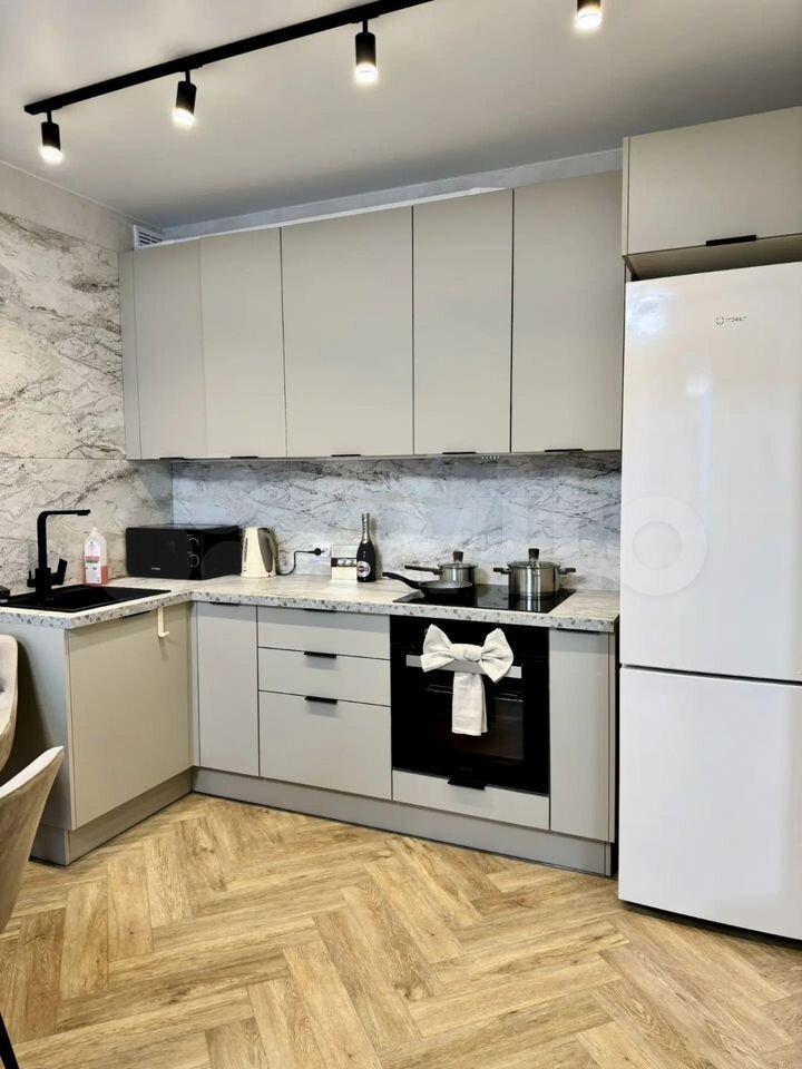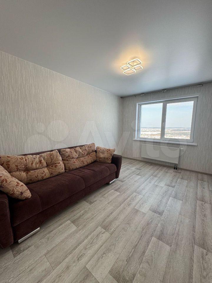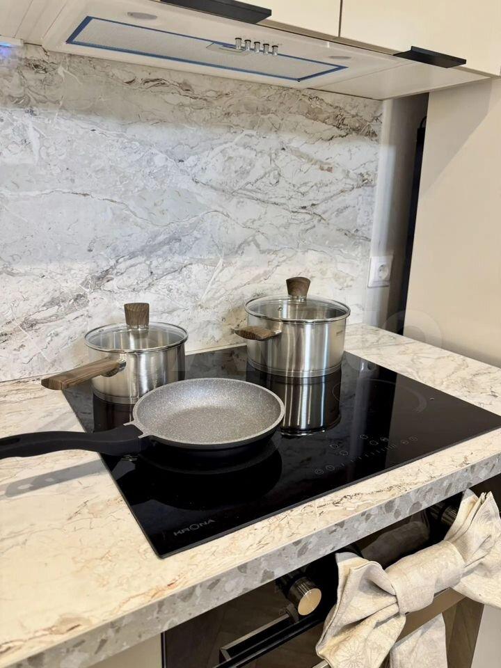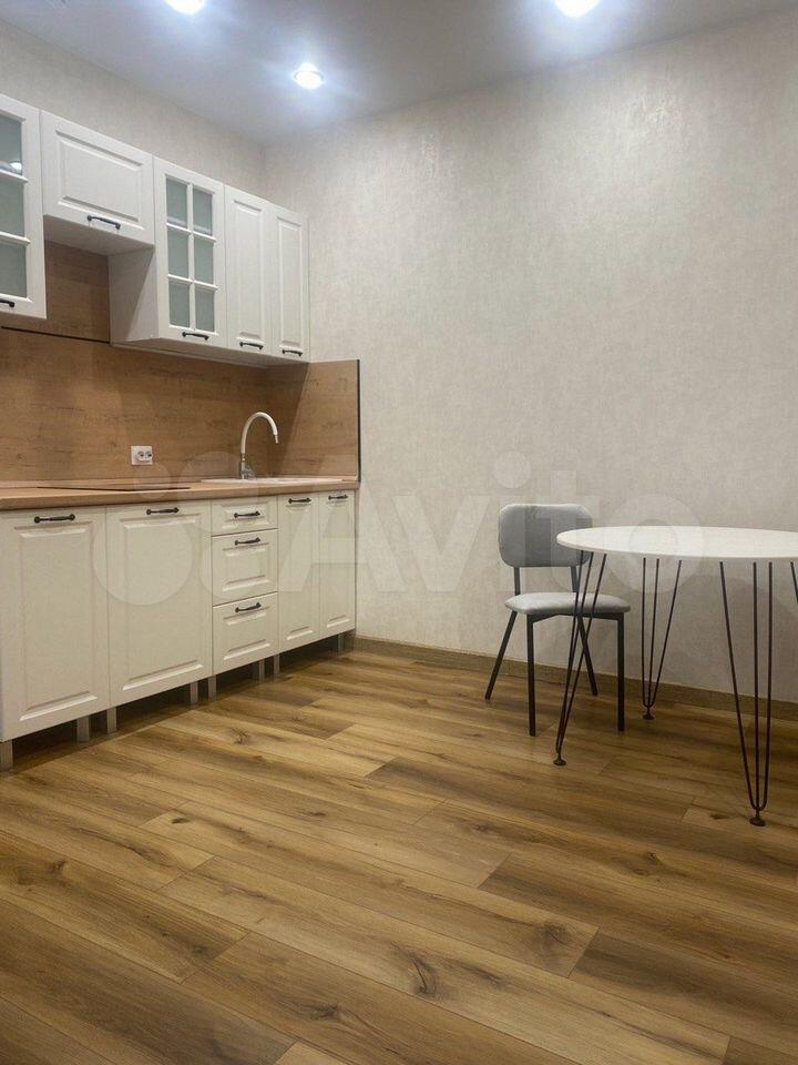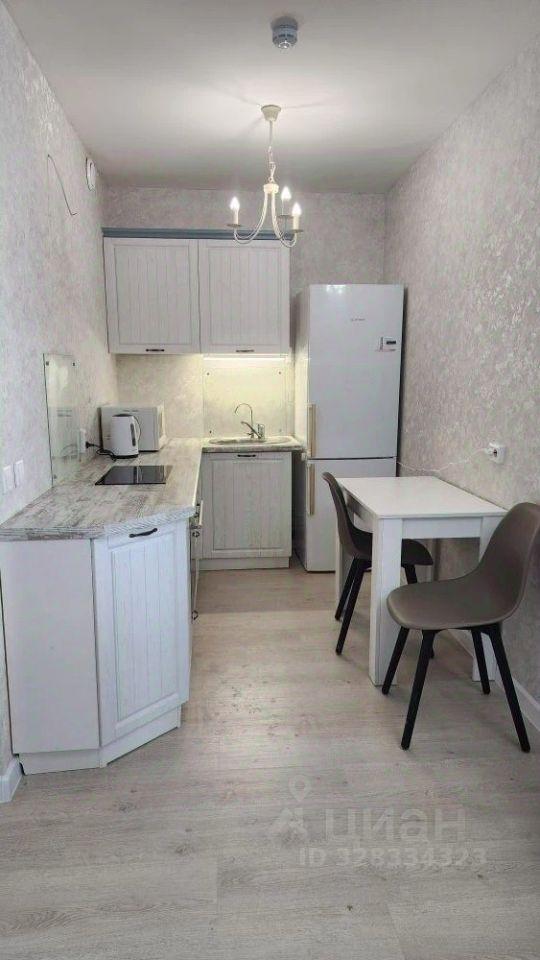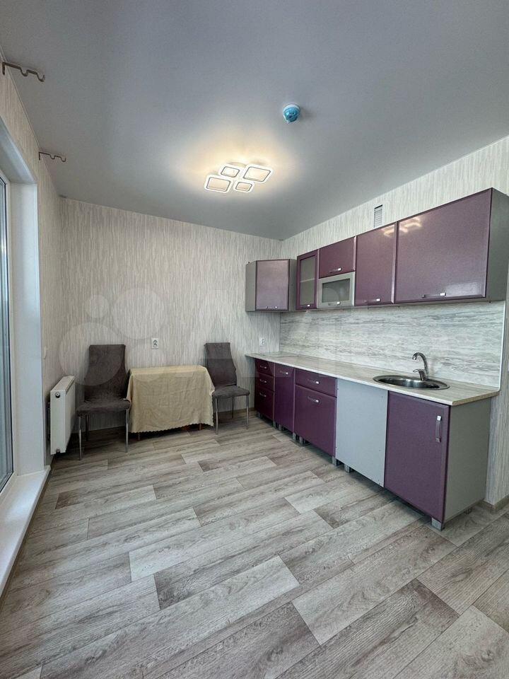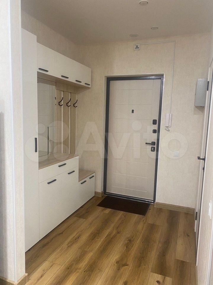 Имеется холодильник, стиральная машина, шкаф, кухонный гарнитур, индукционная плита, диван раскладной, стол, шторы плотная и тюль. Всё новое, в квартире никто не проживал. В квартире выполнен косметический ремонт от застройщика.