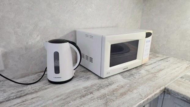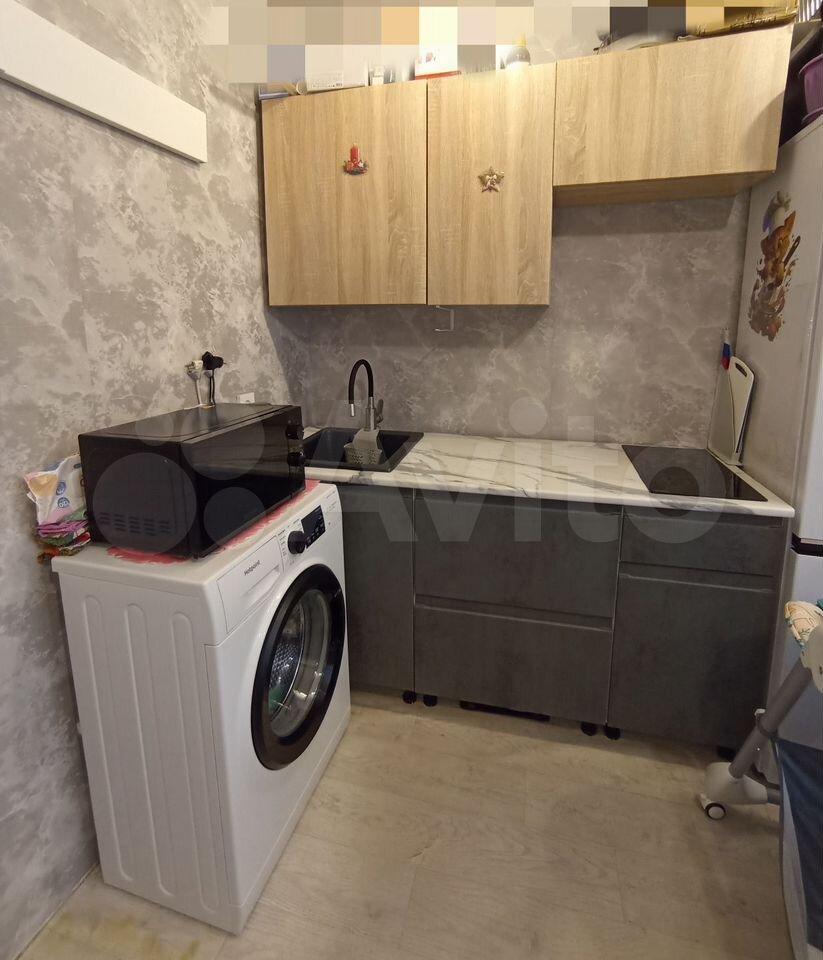 Есть новая стиральная машина, новый холодильник и микроволновка, новый кухонный гарнитур и диван.