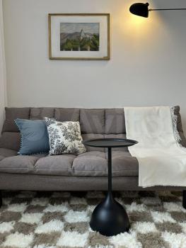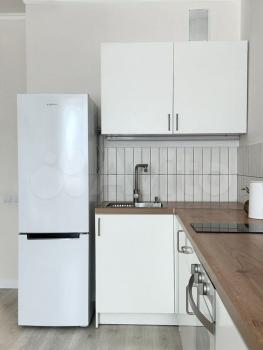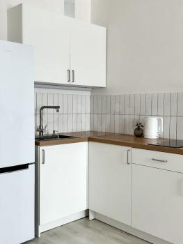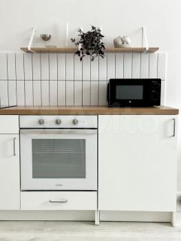 Внутри вас ждет современная кухня с необходимой бытовой техникой: холодильник, индукционная плита, духовой шкаф и микроволновая печь. Также есть вместительные шкафы для хранения вещей. Просторная гостиная зона оформлена в светлых тонах с акцентом на декоративную стену.