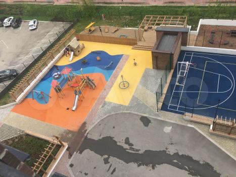 Огромный плюс это то, что у дома есть большая придомовая территория, которая занимает почти 2/3 площади участка строительства. Конечно же, удобная и красивая детская площадка, рассчитанная на детей разных возрастов, спортивная площадка с баскетбольным комплексом и тренажеры. По периметру территории двора предусмотрены велодорожки и тропинки для бега и прогулок. На территории разместятся вело парковка, есть колясочная, два скоростных и бесшумных лифта которые спускаются прямо в паркинг.