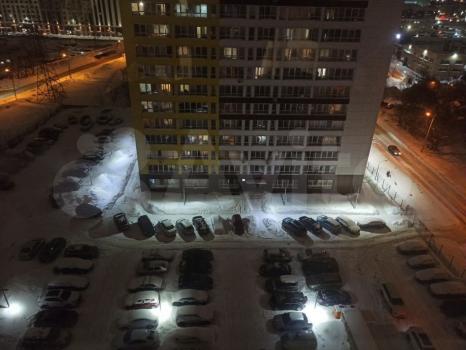 Парковка за шлагбаумом во дворе обеспечивает безопасность автомобиля. Вид из окон открывается на городскую панораму.