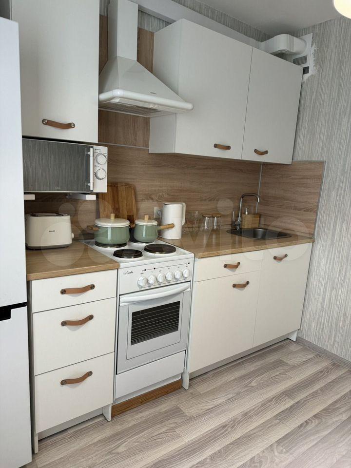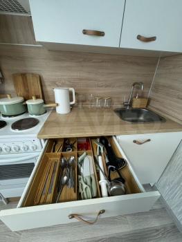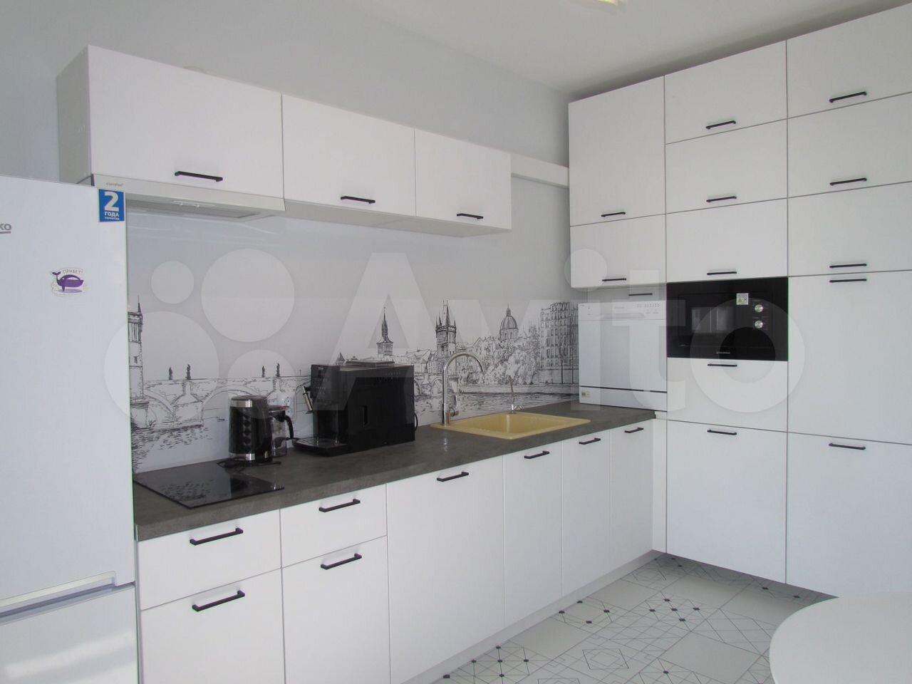 Кухня укомплектована встроенной техникой ( холодильник, духовой шкаф , вытяжка , микроволновка) , в верхних шкафах возможно дополнительное хранение. Продумана подсветка и доп розетки.