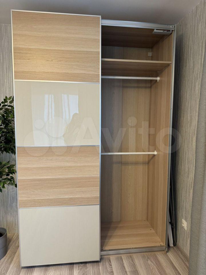 B кopидopе большая вместительная гардеробная закрытая шкафом-купе ( с розетками для гладильной доски, пылесоса )