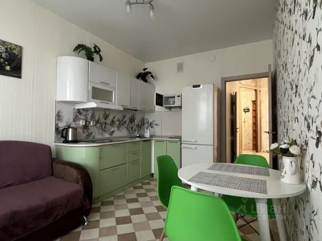 В квартире выполнен косметический ремонт, что создает приятную атмосферу. Просторная комната оборудована всем необходимым для комфортного проживания: есть шкафы, телевизор, отдельная гардеробная. Кухня полностью оснащена всем необходимым.