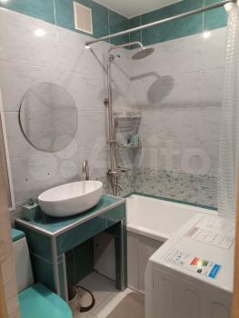 В ванной комнате установлена современная сантехника и новая стиральная машина. Совмещенный санузел оформлен стильной плиткой.