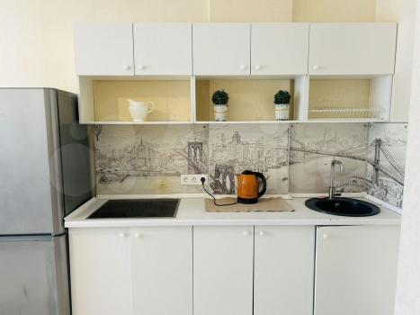Кухня полностью оборудована. Имеется холодильник, микроволновая печь, плита электрическая. Минус только нет духового шкафа. По договоренности можно приобрести. Есть немного посуды, сковородки. Кухонные полотенца.