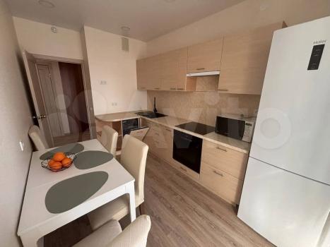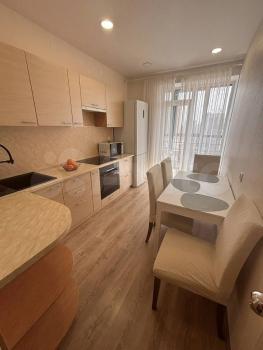 Имеется вся необходимая мебель( обеденный стол,шкаф большой,журнальные столики,кровать спальная,диван раскладной )и техника ( холодильник,телевизоры,микроволновая печь,стиральная машина,плита и духовой шкаф,утюг и гладильная доска)Лоджия застеклена,что позволяет использовать как дополнительное пространство,отделка от застройщика,в квартире курение запрещено,но разрешено жить с детьми.