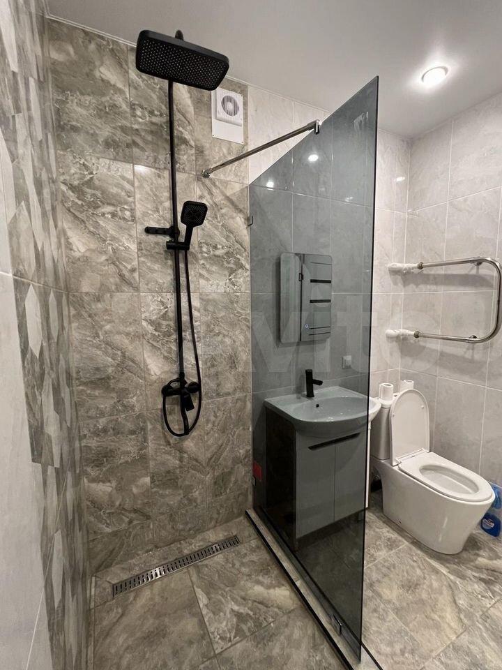 Санузел совмещенный, выполнен в современном стиле. Имеется балкон с видом на город. В подъезде грузовой и пассажирский лифты. Парковка открытая, за шлагбаумом во дворе.