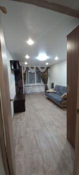 С одной стороны комната выходит на улице на уровне третьего этажа, вторая комната и кухня выходит во двор, окна уровень первого этажа, окна высоко. Квартира чистая, свежий ремонт. В квартире стеклопакеты, натяжной потолок, пол заливной, покрытый качественным ленолиумом, из мебели в одной комнате: шкаф-купе, диван, столик, стул, небольшая стенка; во второй комнате: двухспальная кровать с матрасом, небольшая стенка, угловой шкаф.