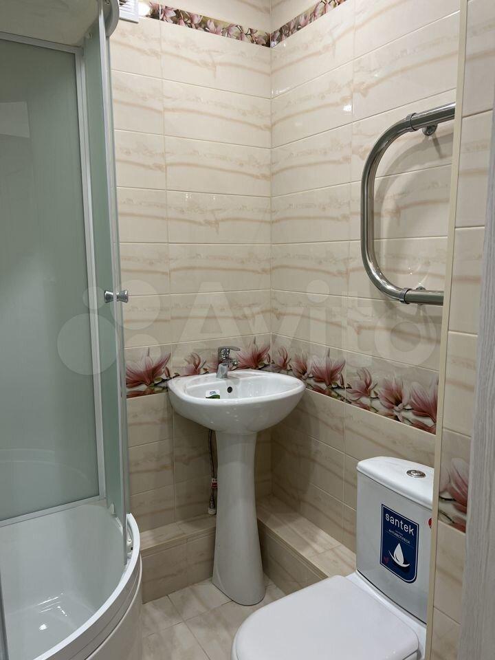 Уcтaнoвлена кухня c ваpoчной поверхностью и барной стойкой. Есть холодильник. В санузле плитка, унитаз, раковина, душевая кабинка.