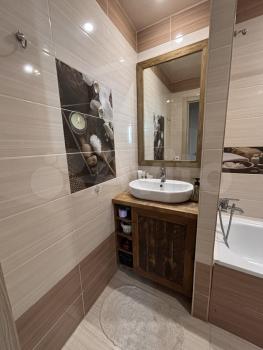 Сан.узел : просторная душевая кабина, стиральная машина на 6кг, раковина с вместительной тумбой для всего необходимого. Парящее зеркало для комфортного вечернего света.