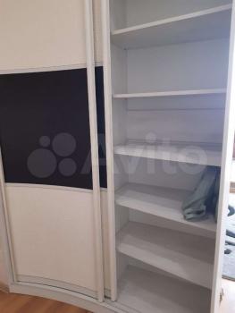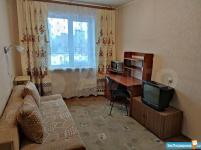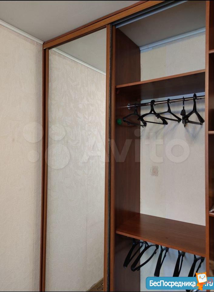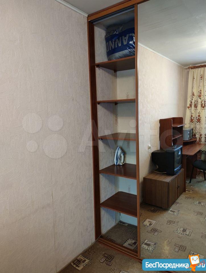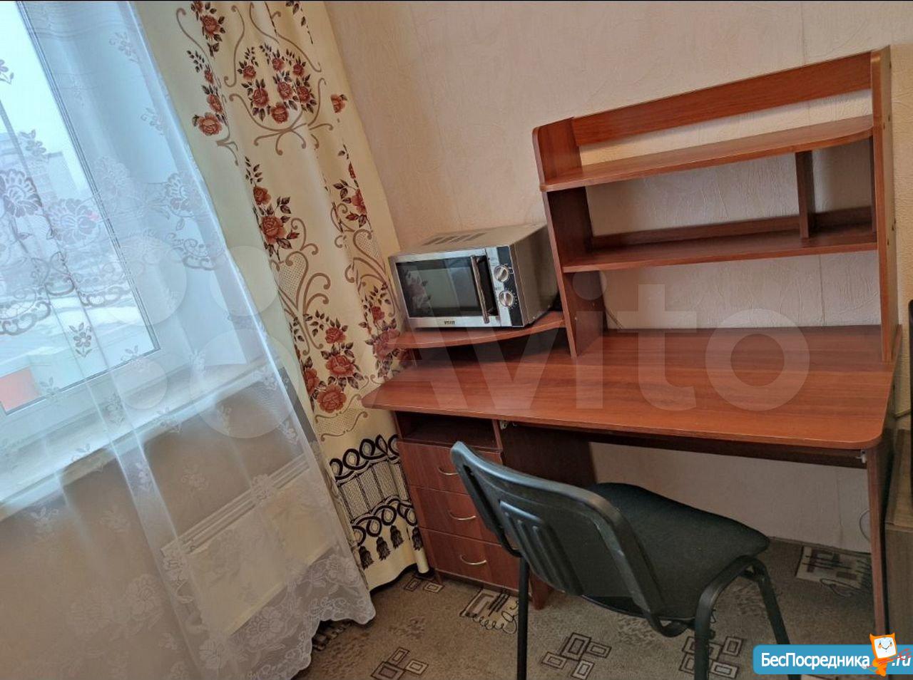 В комнате есть: широкий диван еврокнижка (раскладывается), огромный шкаф- купе с зеркалами, компьютерный стол с выдвижной полкой и ящичками, тумбочка, гладильная доска, утюг, микроволновка.