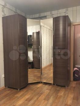 В комнате новый угловой 5-ти дверный шкаф с зеркалами, стенка, кровать.