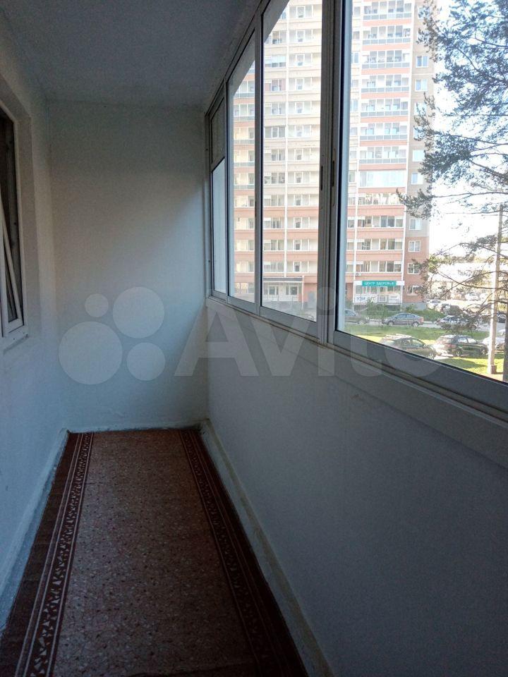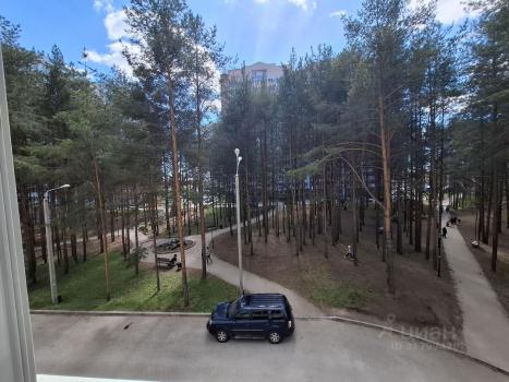В квартире большой балкон с видом на сосновый лес.
