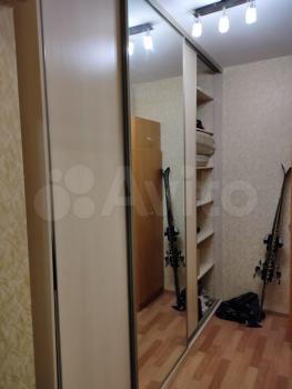 В комнате есть большой шкаф-купе и диван.