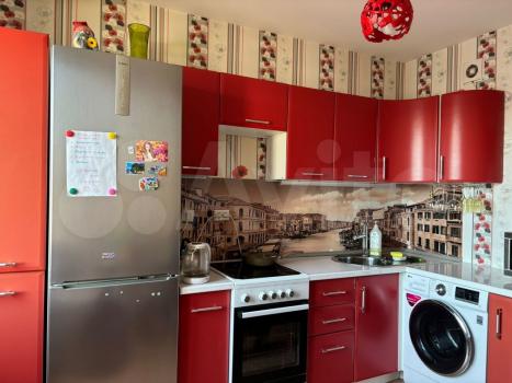 В квартире будет холодильник, стиральная машина, диван, кухонные шкафы вдоль стены, гардеробная.