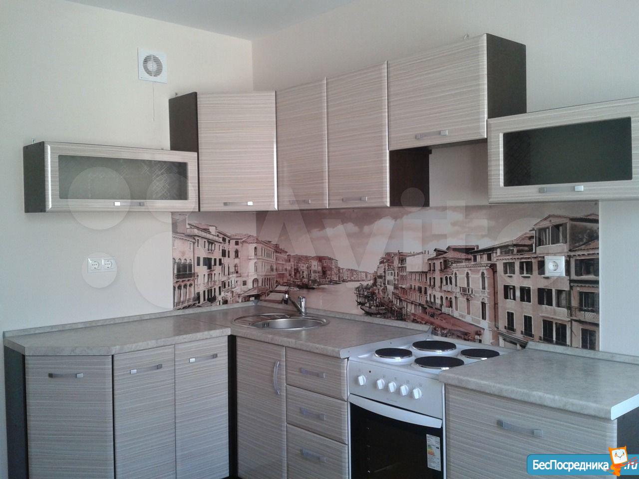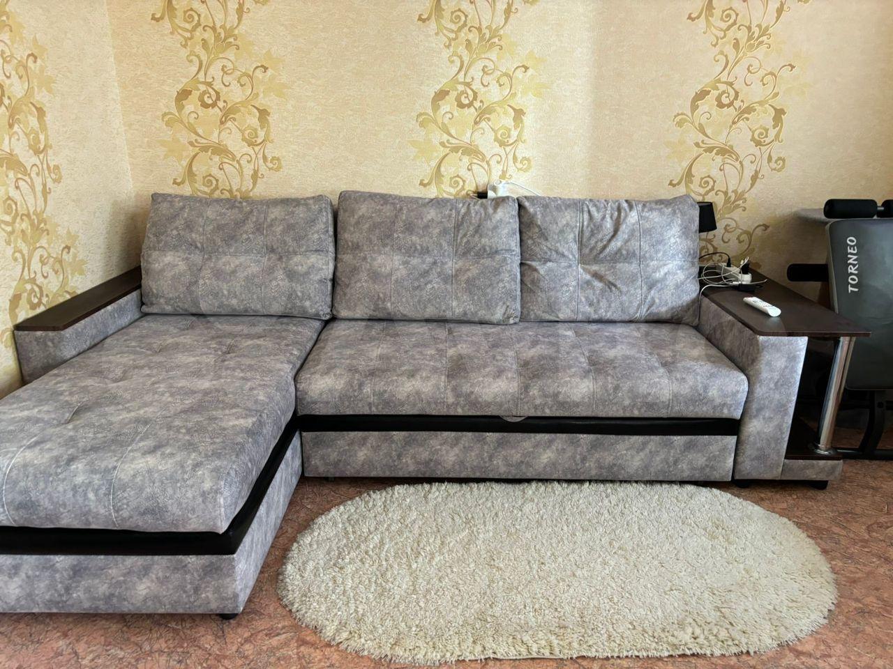 Большой диван раскладной, кухонный гарнитур с варочной поверхностью.