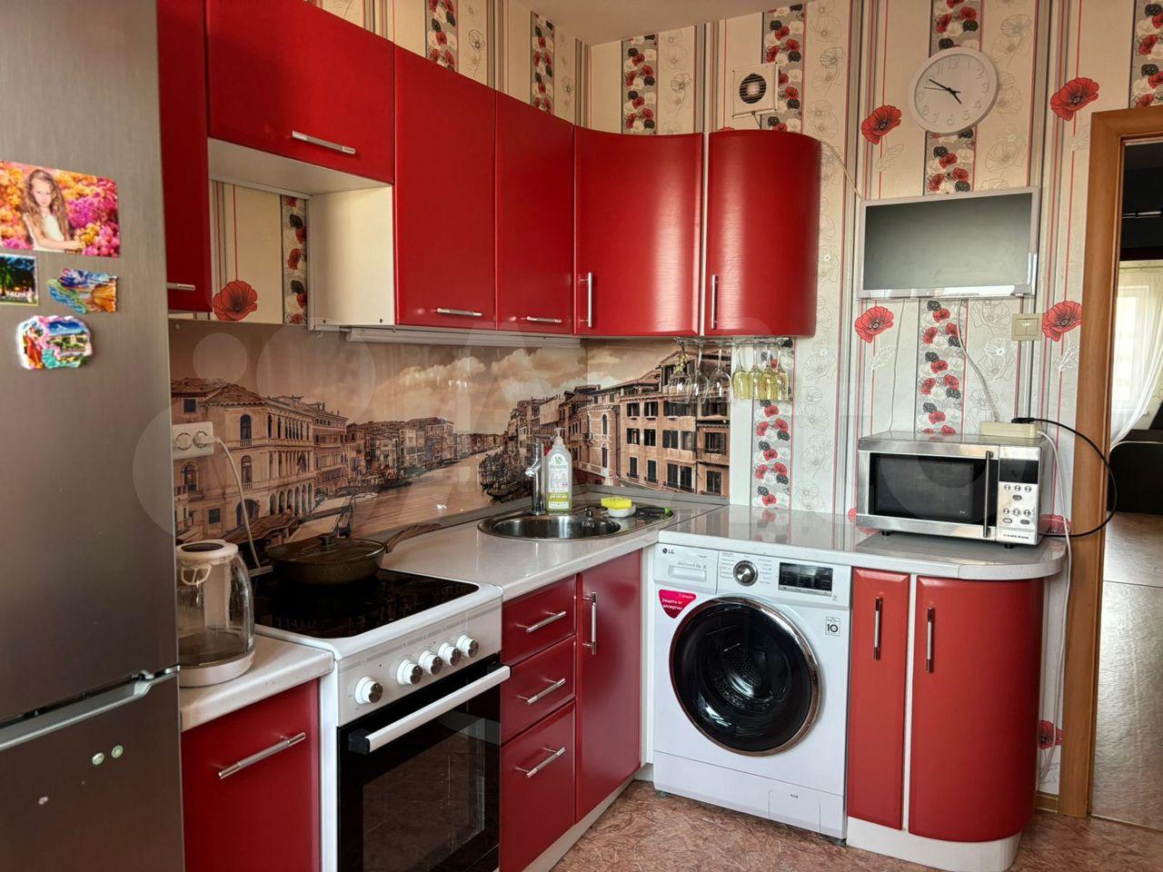 холодильник, плита, микроволновка, стиральная машина, телевизор.
