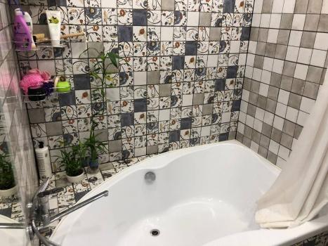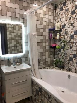 В ванной комнате: теплый пол, зеркало с подсветкой и большая ванная.