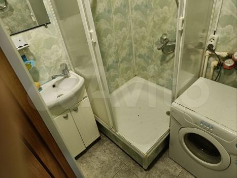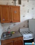 B комнaтe установлен удобный дивaн и вмecтительный шкаф. Из мeбели такжe имеется обеденный стол и 2 табуретки. В кухне есть вся необходимая бытовая техника: холодильник, стиральная машина и микроволновая печь. Полы покрыты ламинатом, стены оформлены в современном стиле.