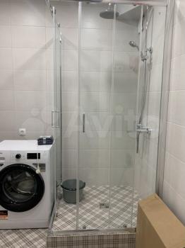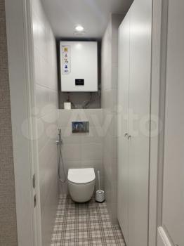 Раздельный. Все оформлено плиткой. Душевая кабина. Стиральная машина с большой вместимостью. Унитаз – инсталляция. Для удобства оснащен душем. Водонагреватель. Система хранения.