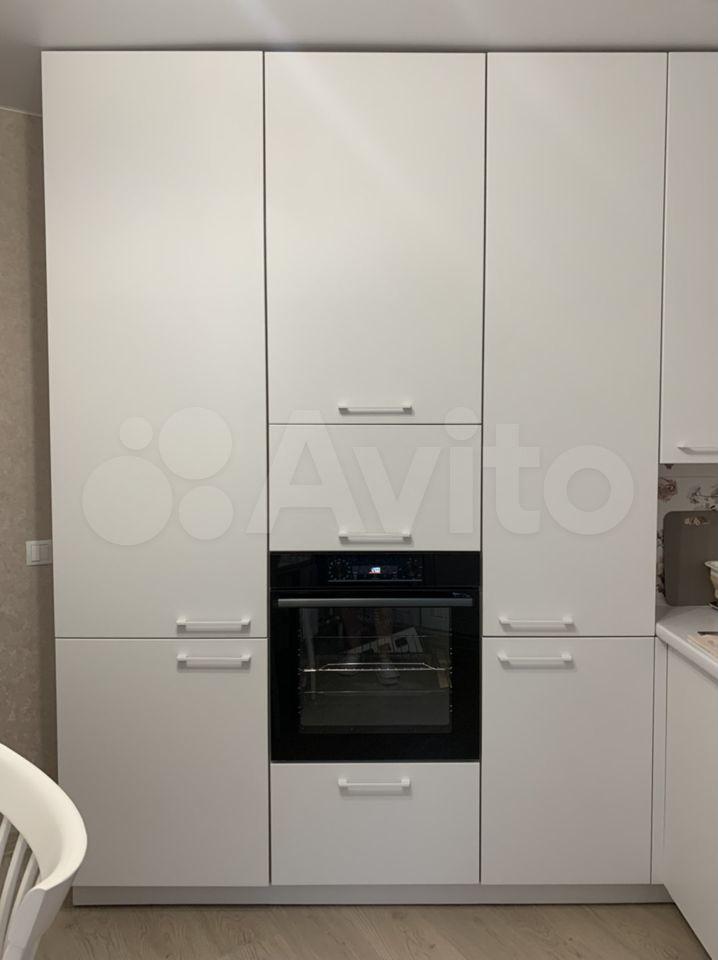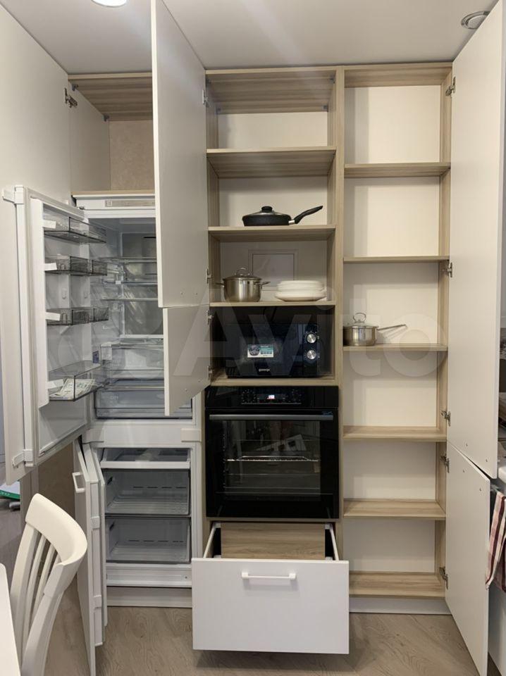 Индукционная плита на 4 конфорки. Вытяжка. Духовой шкаф. Микроволновка. Холодильник. Стол и два стула.