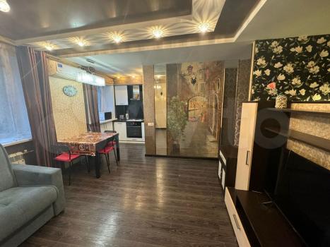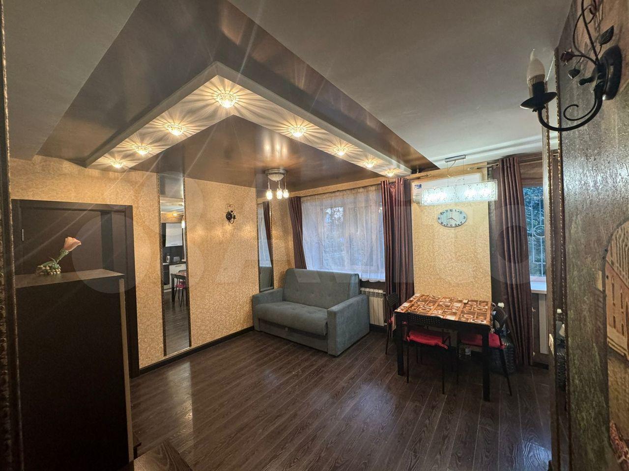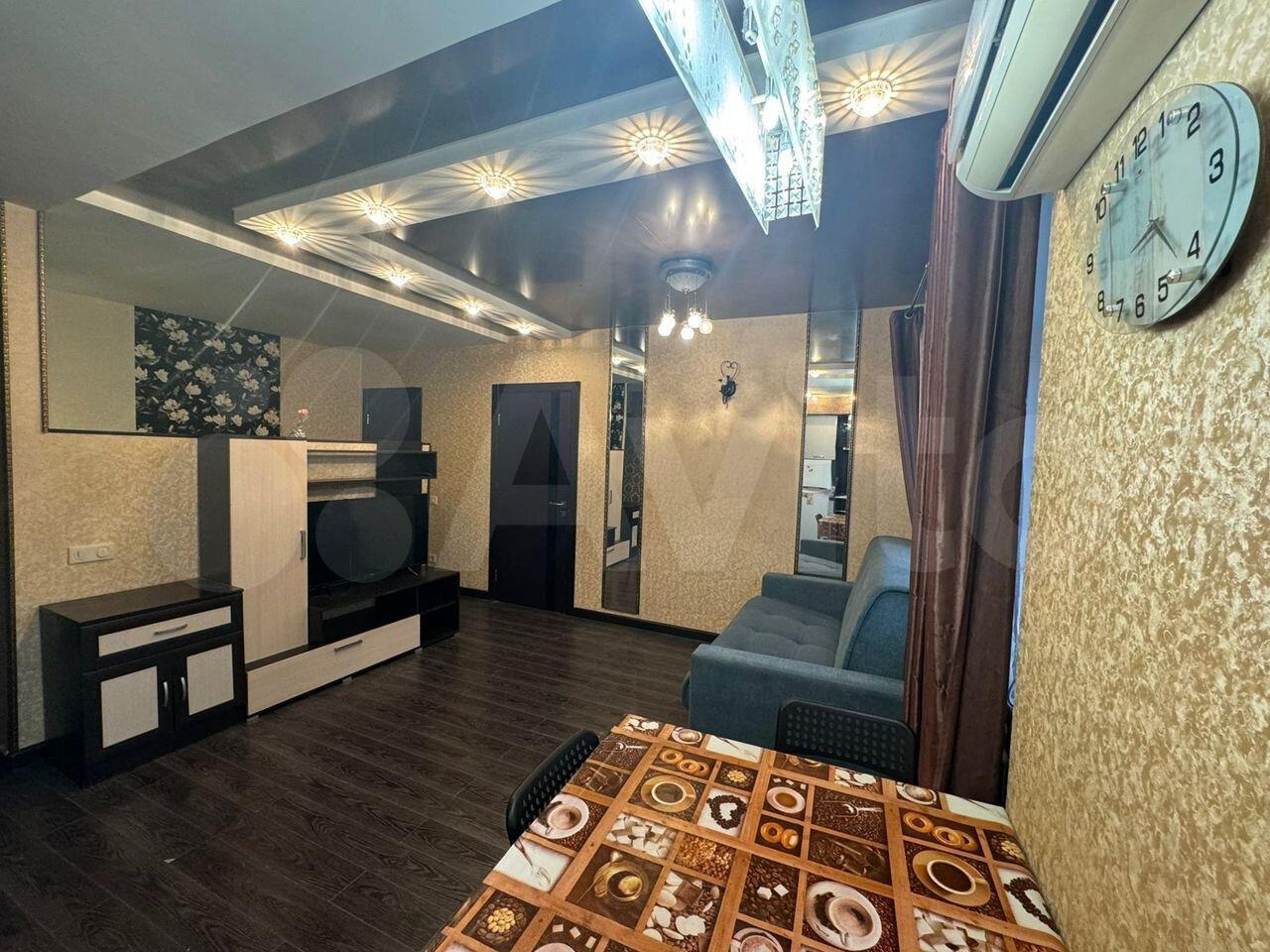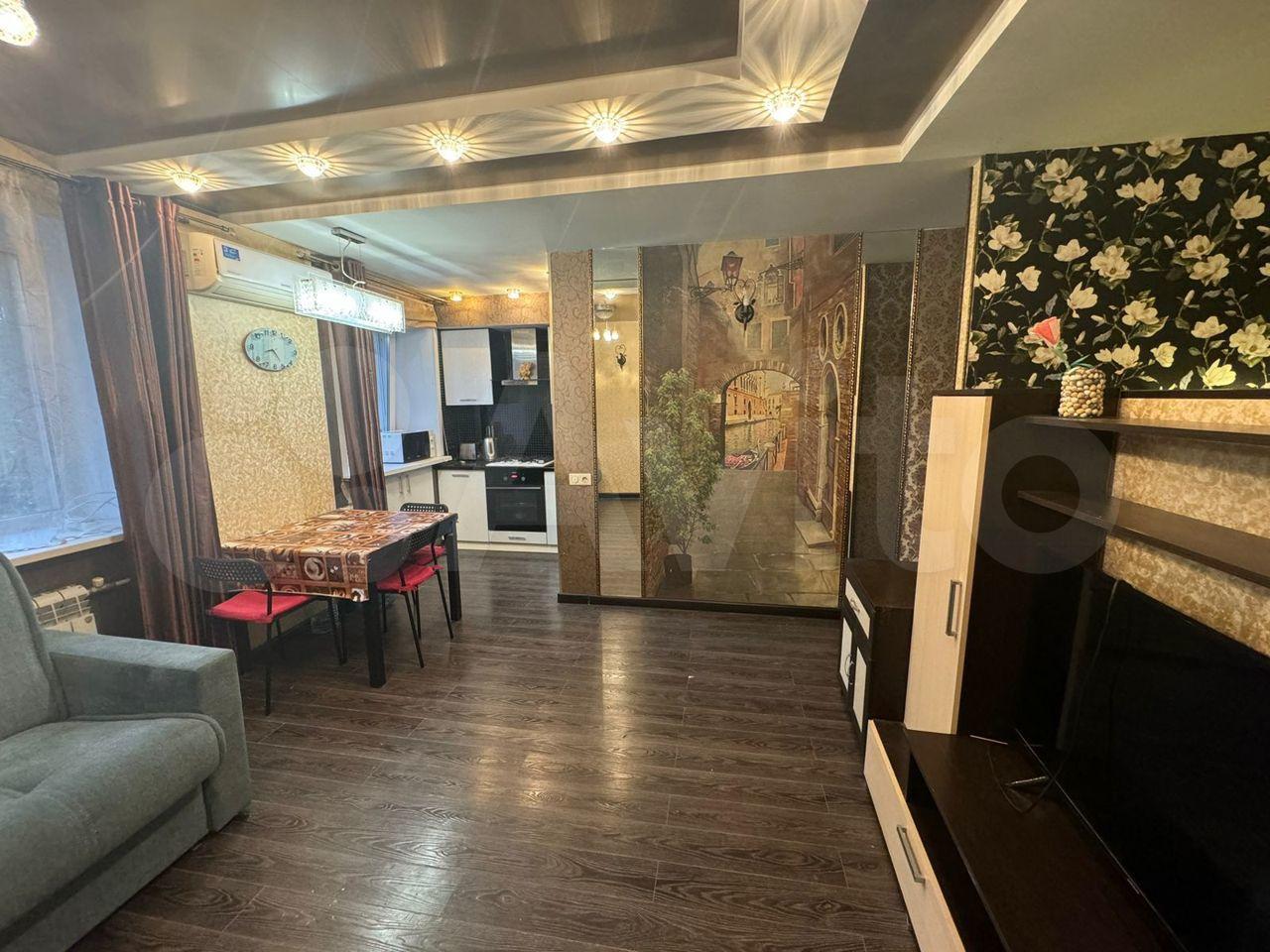 Кухня площадью 6 м² оснащена необходимой техникой, включая холодильник и плиту. Из мебели имеются шкафы и диван. В гостиной установлен телевизор.