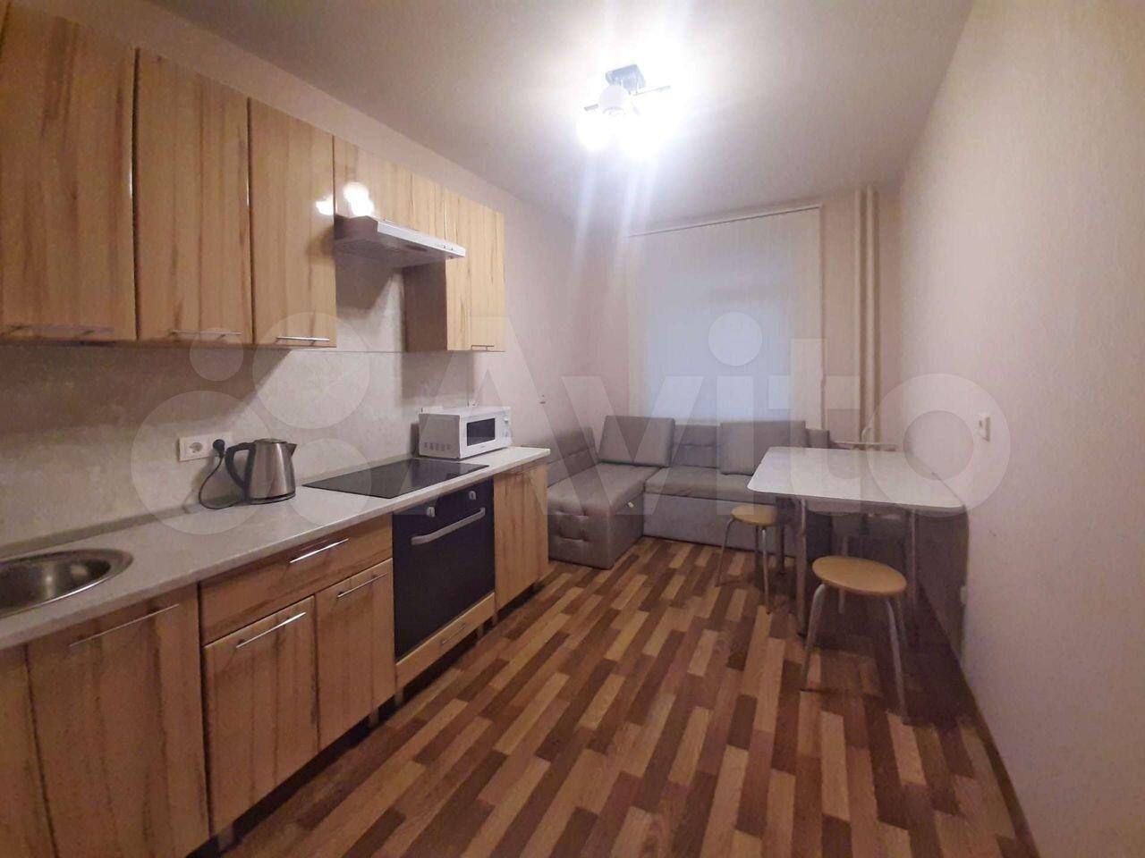 В квартире новая кухня с встроенной плитой, духовым шкафом, вытяжкой, холодильником и стиральной машиной, двухспальная кровать, комод, кухонный стол и стулья. Постельное белье и посуда.