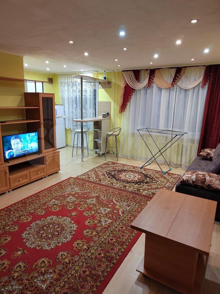 Квартира студия в Орджоникидзовском районе г. Пермь, в хорошем состоянии после косметического ремонта. В квартире имеется диван, большой встроенный шкаф, большое зеркало, стиральная машина, холодильник, микроволновка, индукционная плита, стулья, стол обеденный.