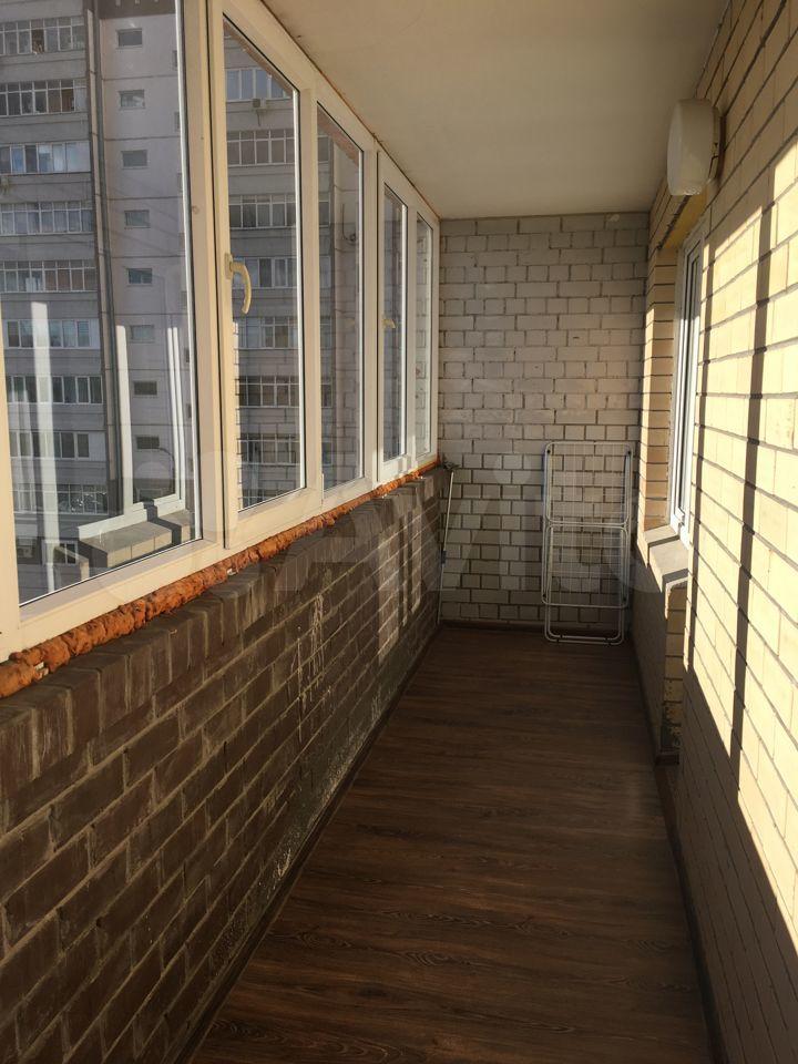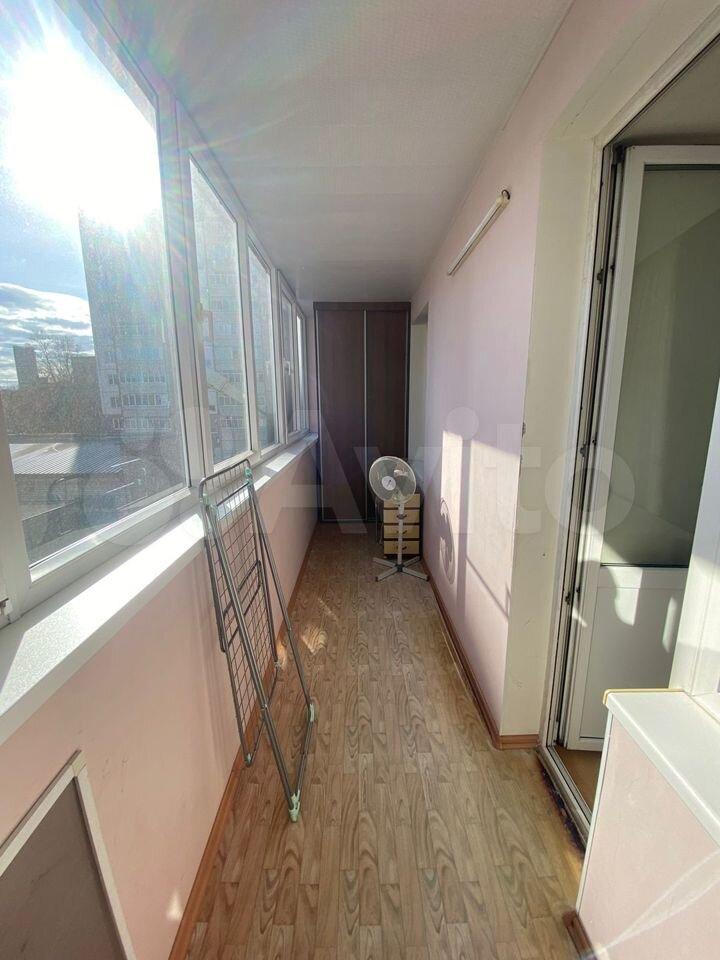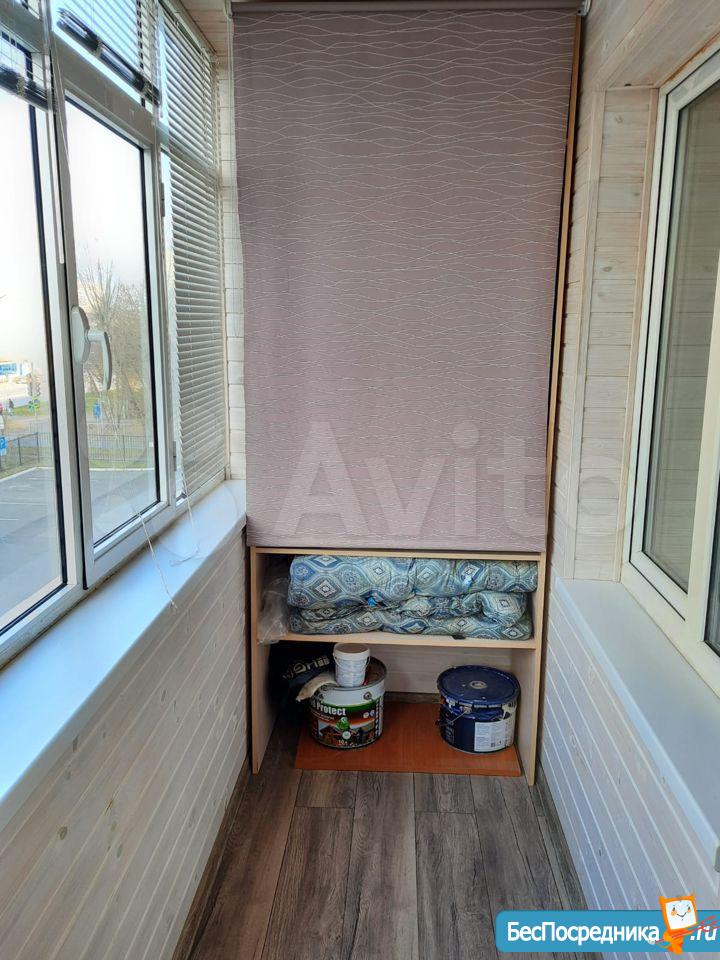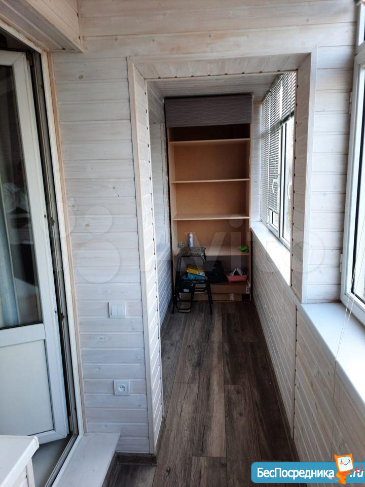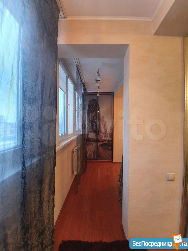 Окна стеклопакет, застекленная большая лоджия, на полу ламинат в комнате, линолеум в коридоре и на кухне.