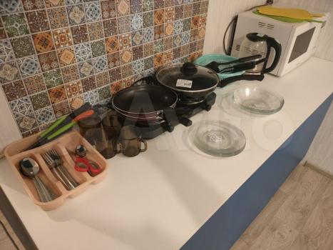 Уютная кухня, для каждой комнаты свой отдельный ящик. На кухне стол и стулья. Квартира оснащена вытяжкой, газовой панелью. Посуда вся в наличии, кастрюли, тарелки, чашки и ложки, сковородка, в общем все для комфортного приготовления пищи.