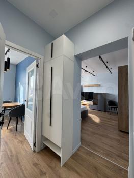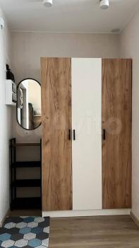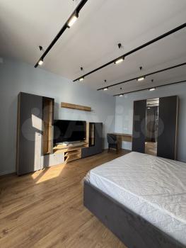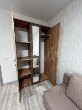В гостиной установлен удобный диван и телевизор, а также вместительный шкаф для одежды. В спальне — большая кровать и вместительный шкаф-купе.