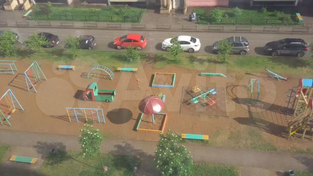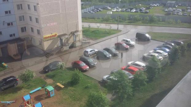 Во дворе: парковка с одной стороны, огороженная детская площадка - с другой.