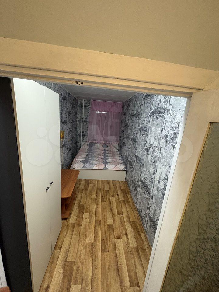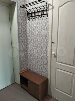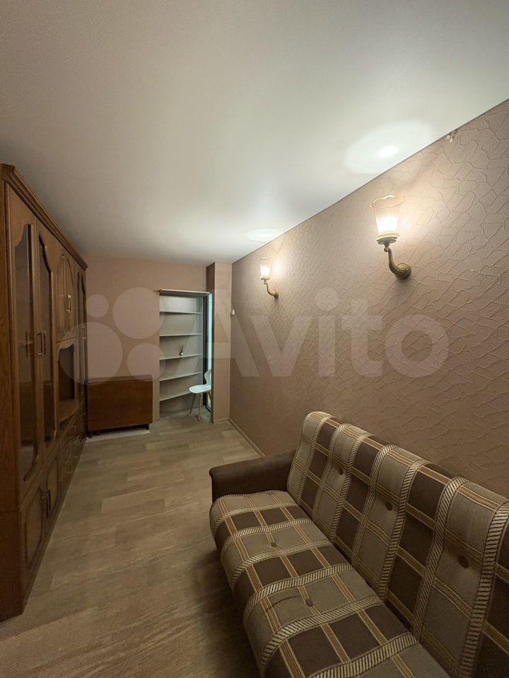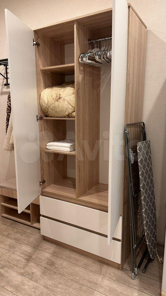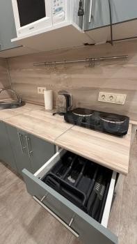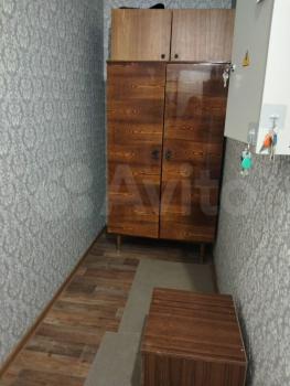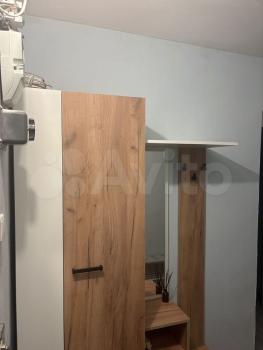 В комнате установлен удобный диван и вместительный шкаф и комод, обеспечивающие достаточно места для хранения вещей. Из мебели также имеется обеденный стол и стулья. Кухня оборудована необходимой техникой, включая холодильник и микроволновую печь.