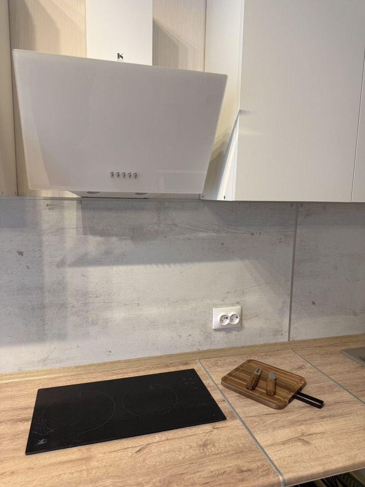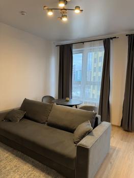 Имеется холодильник, стиральная машина, шкаф, кухонный гарнитур, индукционная плита, диван раскладной, стол, шторы плотная и тюль. Всё новое, в квартире никто не проживал. В квартире выполнен косметический ремонт от застройщика.