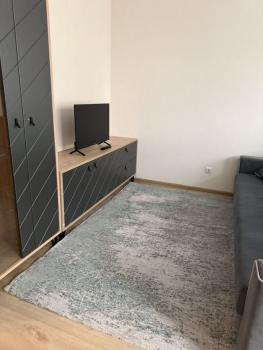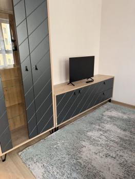 В квартире имеется вся необходимая мебель: шкаф, комод, удобный диван, обеденная группа с комфортными стульями , большой телевизор .