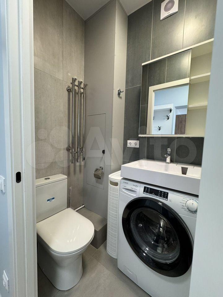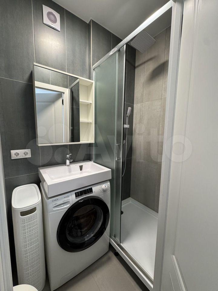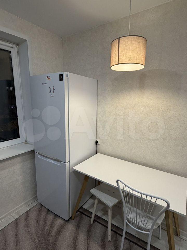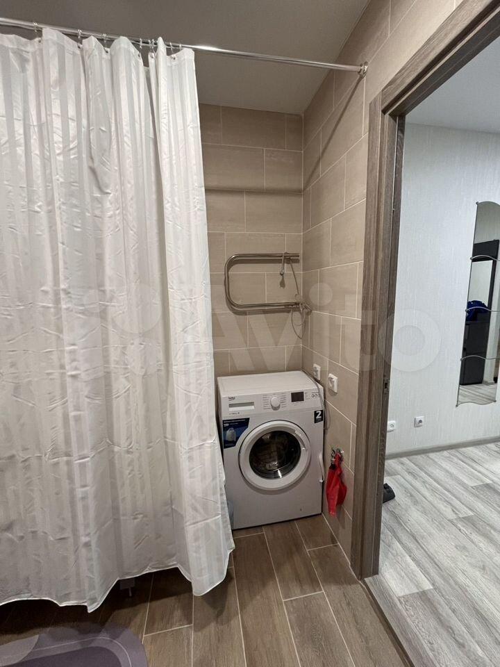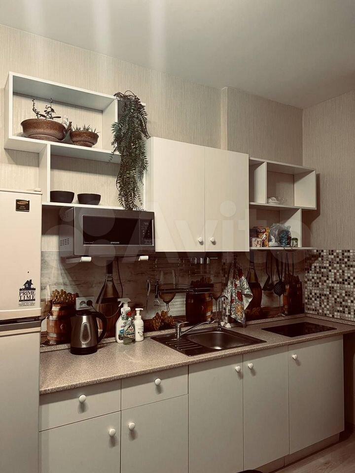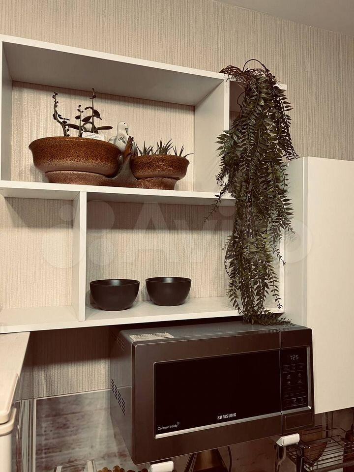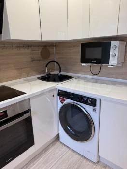 Кухня площадью 5 м² оборудована современной техникой: холодильник, микроволновая печь и стиральная машина. Встроенные шкафы обеспечивают достаточно места для хранения.
