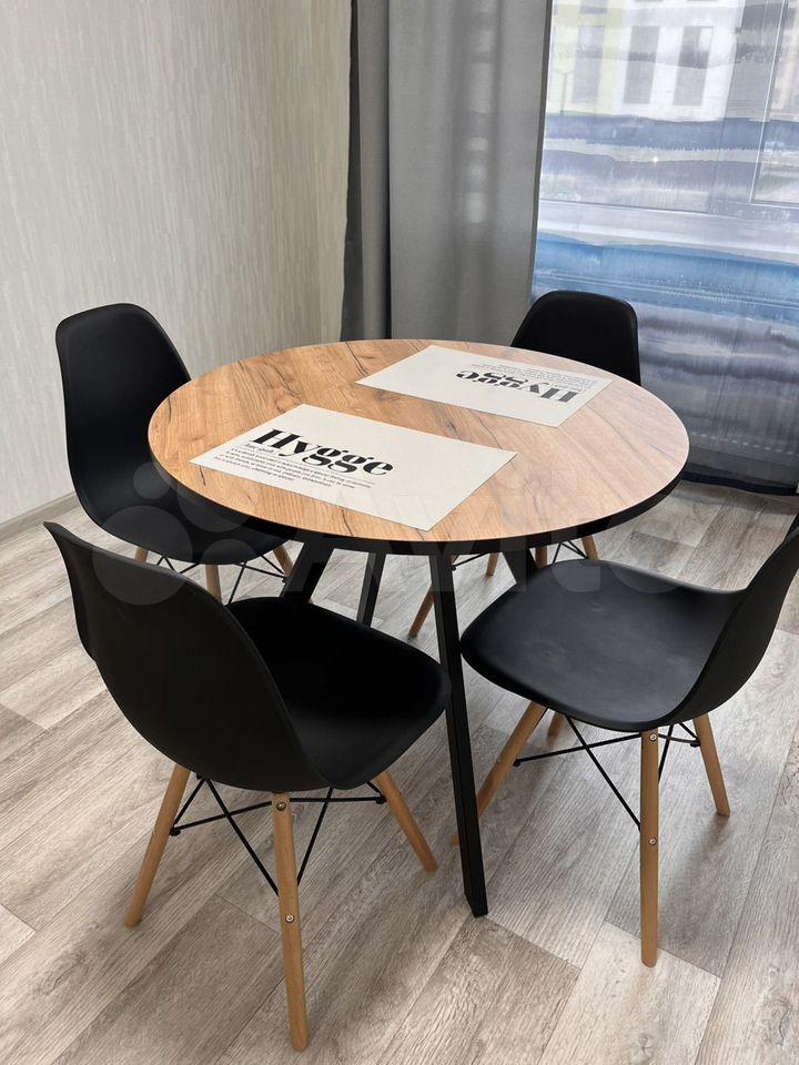 В квартире оставляем кровать с матрасом, встроенный шкаф купе с зеркальными дверями, стол и стулья на кухне