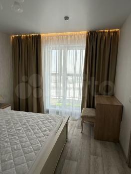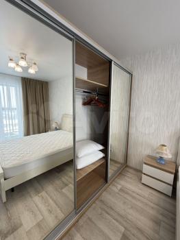 В спальне удобная кровать, шторы блэкаут, вместительный шкаф и рабочее место.