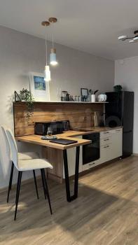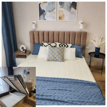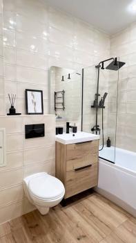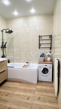 -B квартире сделан качественный ремонт. Есть все необходимое: кондиционер, телевизор, холодильник, варочная поверхность, духовка, стиральная машина, сушилка для белья, гладильная доска, утюг, чайник, СВЧ.