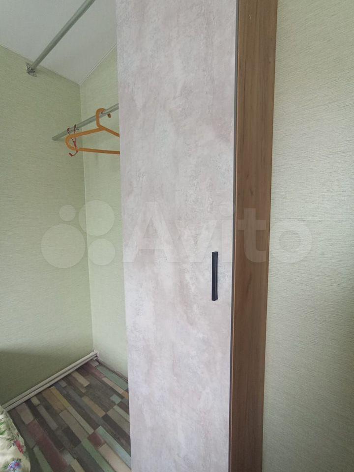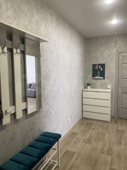В квартире сделан свежий косметический ремонт. На кухне гарнитур, обеденный стол, табуретки. В комнате - шкаф-купе и журнальный столик, в прихожей кладовочка и вешалка для одежды. В санузле шкафчик с зеркалом и раковина на тумбе.