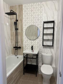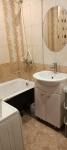Ремонт выполнен качественно, с вниманием к мелочам (рулонные шторы блэкаут, кухня-гостиная с барной стойкой, разделяющей пространство, трековые светильники (можно регулировать угол освещения) над кухонным гарнитуром, поддон под кухонной мойкой, сушилка для посуды из нержавейки, улучшено освещение в ванной, имеется возможность подключить доп. светильник, есть подводы к водонагревателю, гардина шторы в ванне спрятана в натяжной потолок и огибает ванну, обрамление ванной жалюзийными дверцами, регулируемый по высоте и наклону держатель лейки для душа).